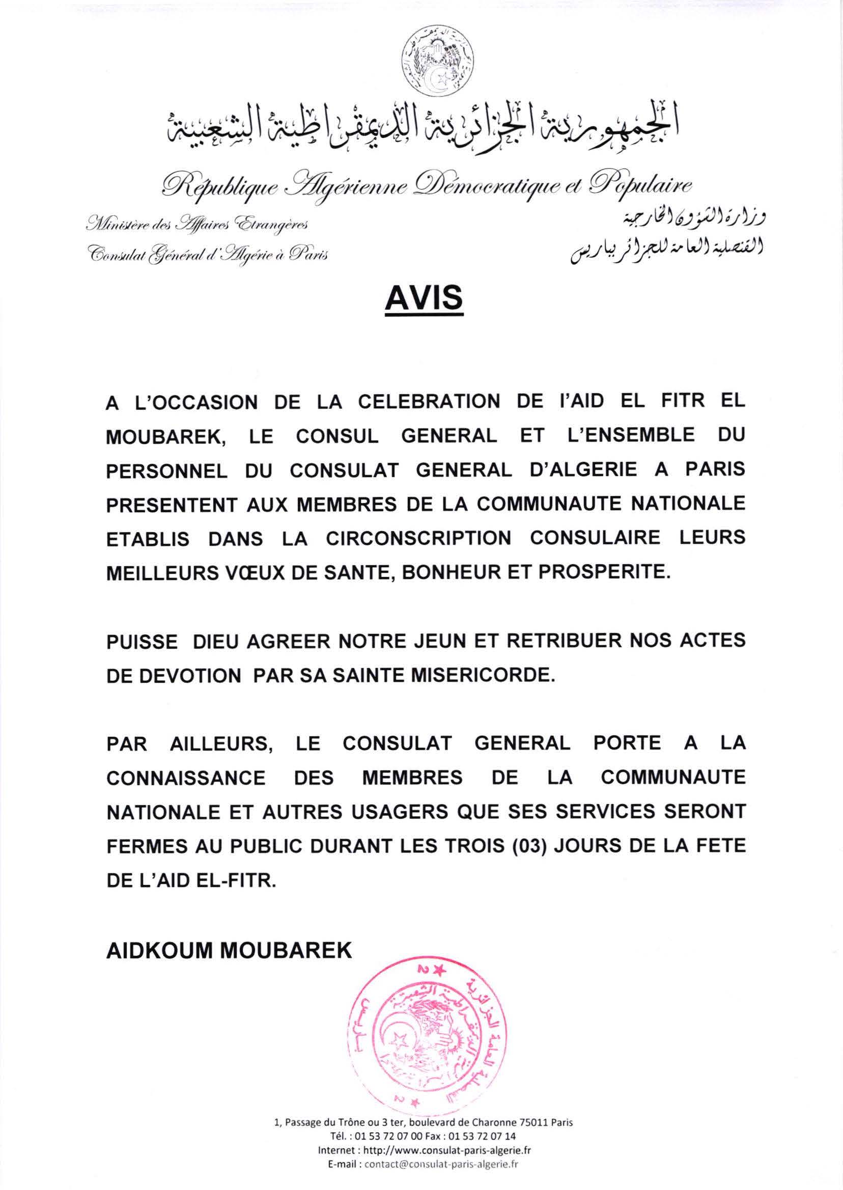 AVIS DE FERMETURE : AID EL FITR 2026