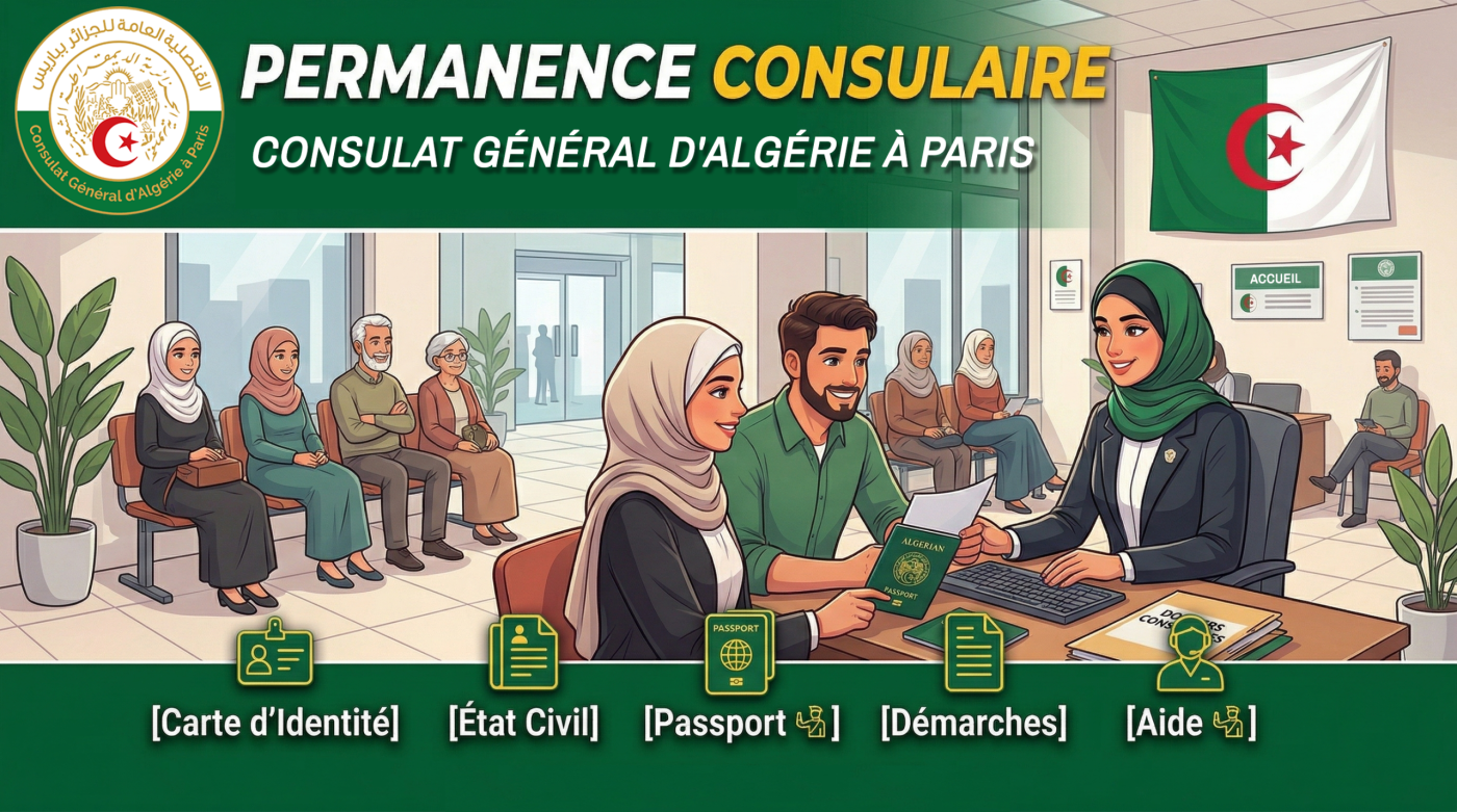 Le Consulat Général d’Algérie à Paris informe les ressortissants relevant de sa circonscription qu’une permanence consulaire se tiendra à Blois le dimanche 26 avril 2026, en coordination avec :